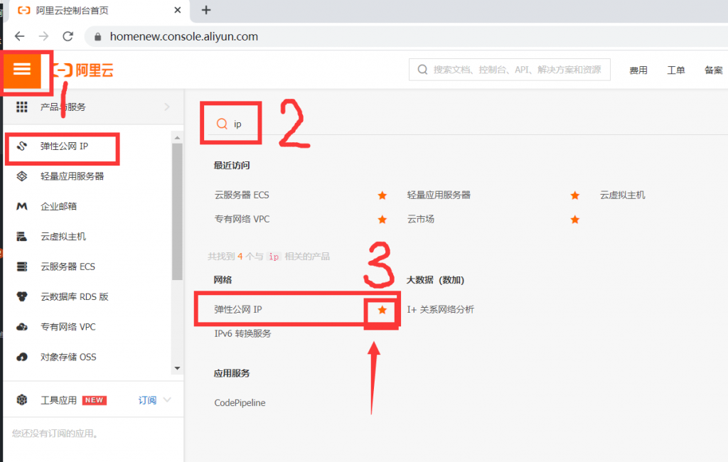 1.打开弹性ip控制台。 多种方法打开。如图: