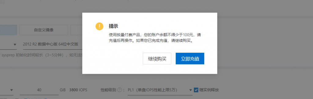 点下一步,然后需要充值100元。说明一下:阿里云按量后付费的服务器必须要在账号里充值100元!