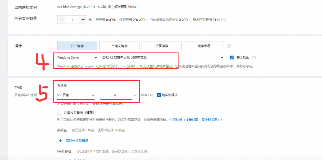 4.选择操作系统,windows2012 64位中文版; 5选择系统硬盘类型为SSD,固态硬盘;大小为:40G,需要大硬盘可以增加调整数值。 也可以增加D盘。 截图如下: