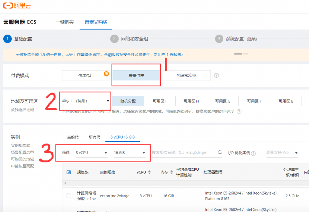 分别选择1、按量付费。( 此处为关键 ), 2、选择机房地址。 3、 选择 服务器配置,cpu和内存。截图如下: