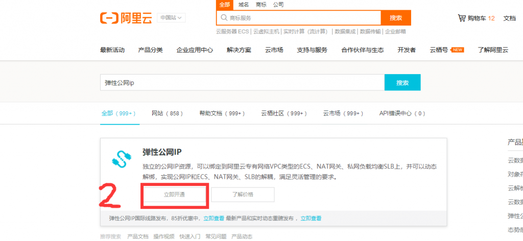 1.详细步骤如下: 打开官网首页www.aliyun.com,输入关键词:弹性公网ip,点搜索