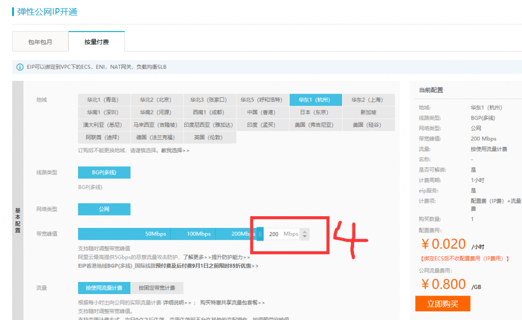 4.出来页面后如图,选机房,一定选择对; 然后选择按量付费的带宽为200M,截图如下: